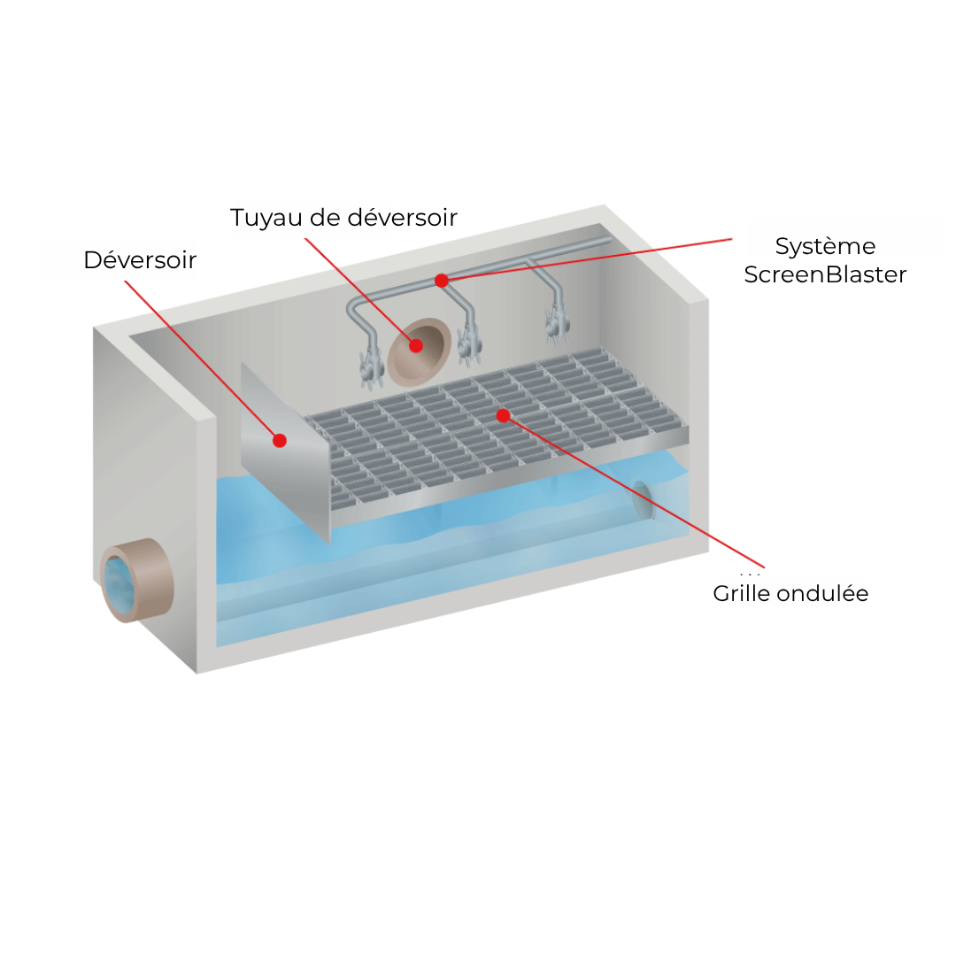 Un composant clé de la chambre est le système de criblage. Ce dernier contient une grille qui retient les matières solides présentes dans l’eau de débordement et les maintient à l’intérieur du réseau d’assainissement, les empêchant ainsi d’être rejetées dans le milieu naturel. En d’autres termes, les grilles empêchent les déchets les plus grossiers de quitter le système d’eaux usées.