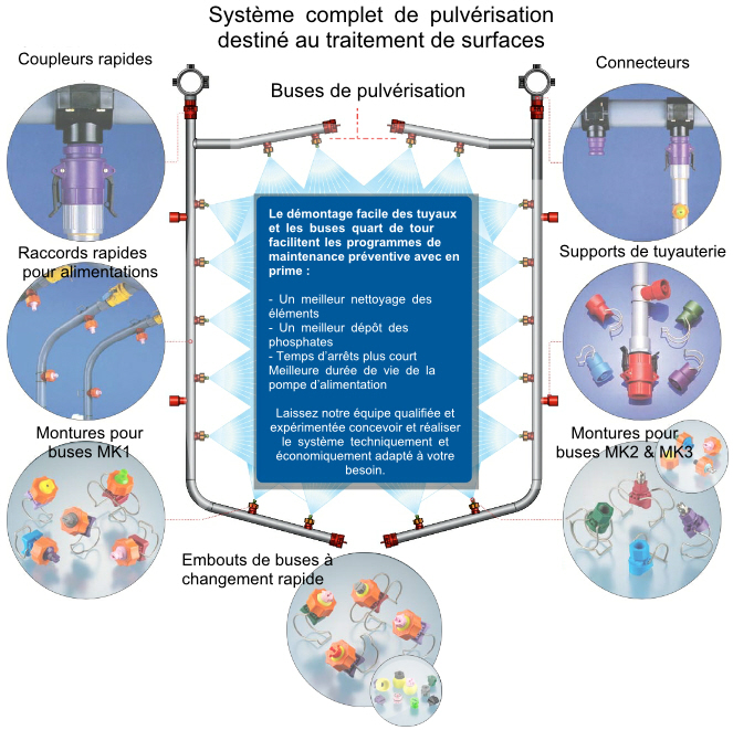 Chaque élément de ce système est détaillé dans la rubrique "Buses pour le traitement de surface" accessible via le menu gris sur la droite de cette page.
