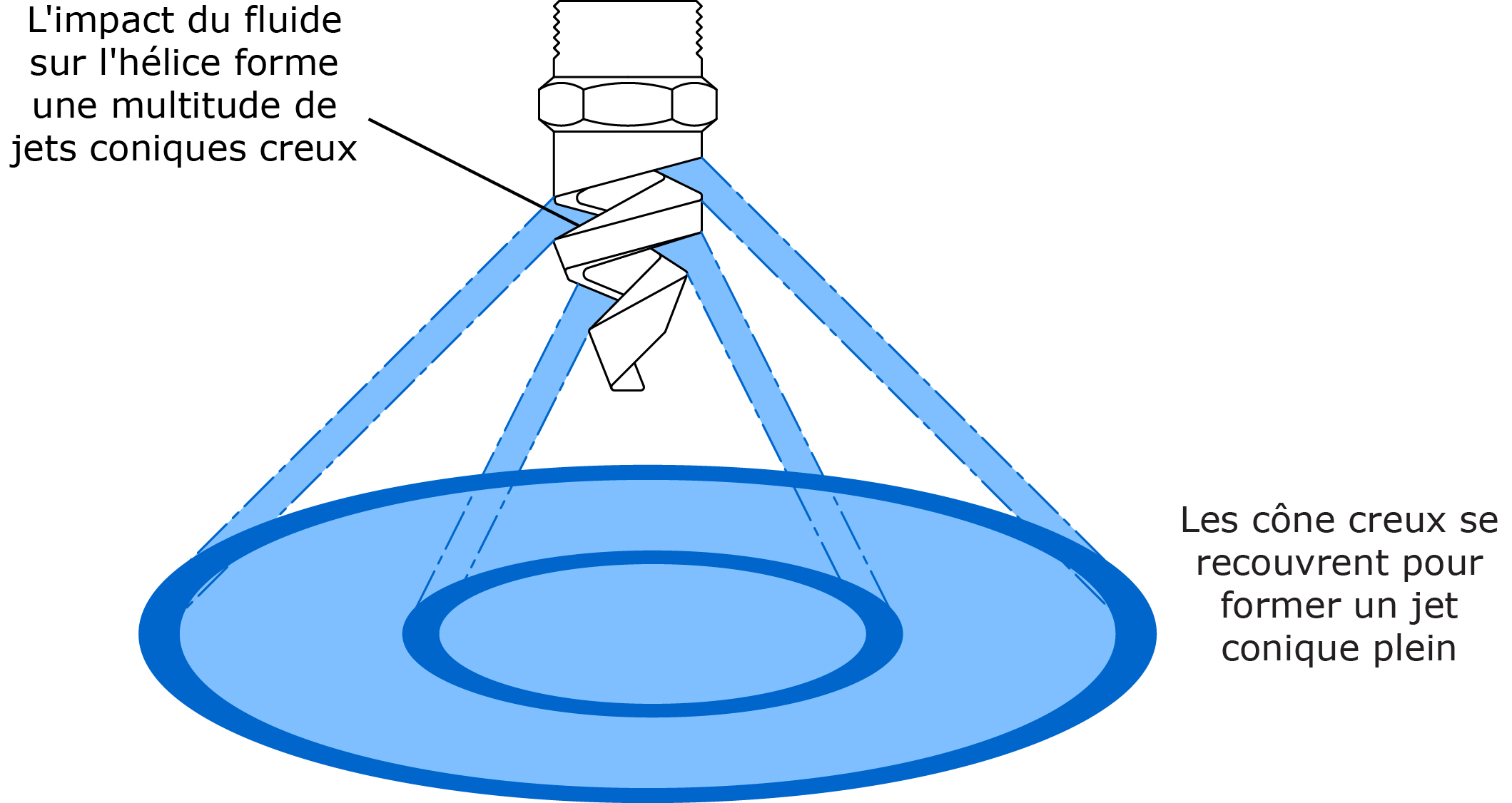 La pulvérisation est formée par l’impact du liquide sur la surface interne de l’hélice après sa sortie de la buse. Le liquide est alors éjecté de l’hélice pour former la pulvérisation. Ce type de buse produit en fait une multitude de jets en forme d’anneaux concentriques qui finissent par former ensemble un cône. En faisant varier la géométrie de l’hélice, on peut former un jet conique creux.