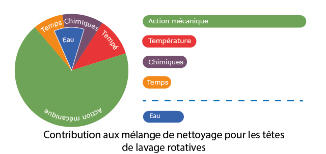 Toute action de nettoyage comporte quatre éléments: action mécanique, chaleur, action chimique et temps. La consommation globale de liquide est une fonction du temps et des composants de l’action chimique. Le choix de la tête de nettoyage de cuve affectera considérablement le mélange de ces éléments. Optimiser les systèmes de nettoyage des contenants pour réduire l’utilisation de caustique ou d’eau implique de comprendre comment chaque tête de nettoyage de citerne affecte ce mélange. Les quatre éléments d'une opération de nettoyage de réservoir sont représentés par des diagrammes circulaires Sinner, comme illustré ci-dessous.